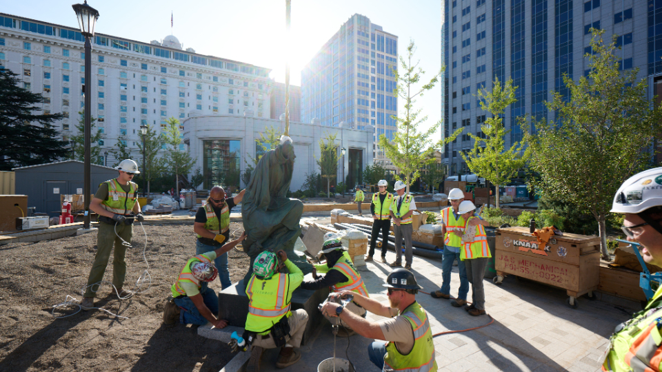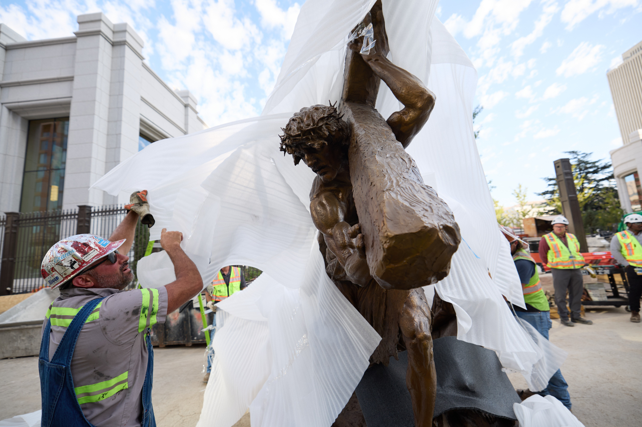 Both statues visualize transcendent moments in the life, teachings and ministry of Jesus Christ and enhance the sacred atmosphere of the renovation work underway at Temple Square.