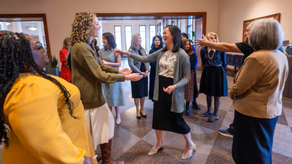 Sister Kristin M. Yee, center, Second Counselor in the Relief Society General Presidency, reaches to embrace Sister Andrea McConkie of the Relief Society General Advisory Council during the filming of the March 2026 Relief Society devotional in the Conference Center in Salt Lake City on Friday, December 5, 2025. Photo by Scott G Winterton, courtesy of Church News.Copyright 2026 Deseret News Publishing Company.Sister Miner expects women will watch the videos and discuss the subjects raised in their own wards and branches, in neighborhoods and with friends. “It is an opportunity to discuss the challenges we all face, how turning to Jesus Christ helps us, and also the joys of being a member of the Relief Society and a member of The Church of Jesus Christ of Latter-day Saints,” she said.