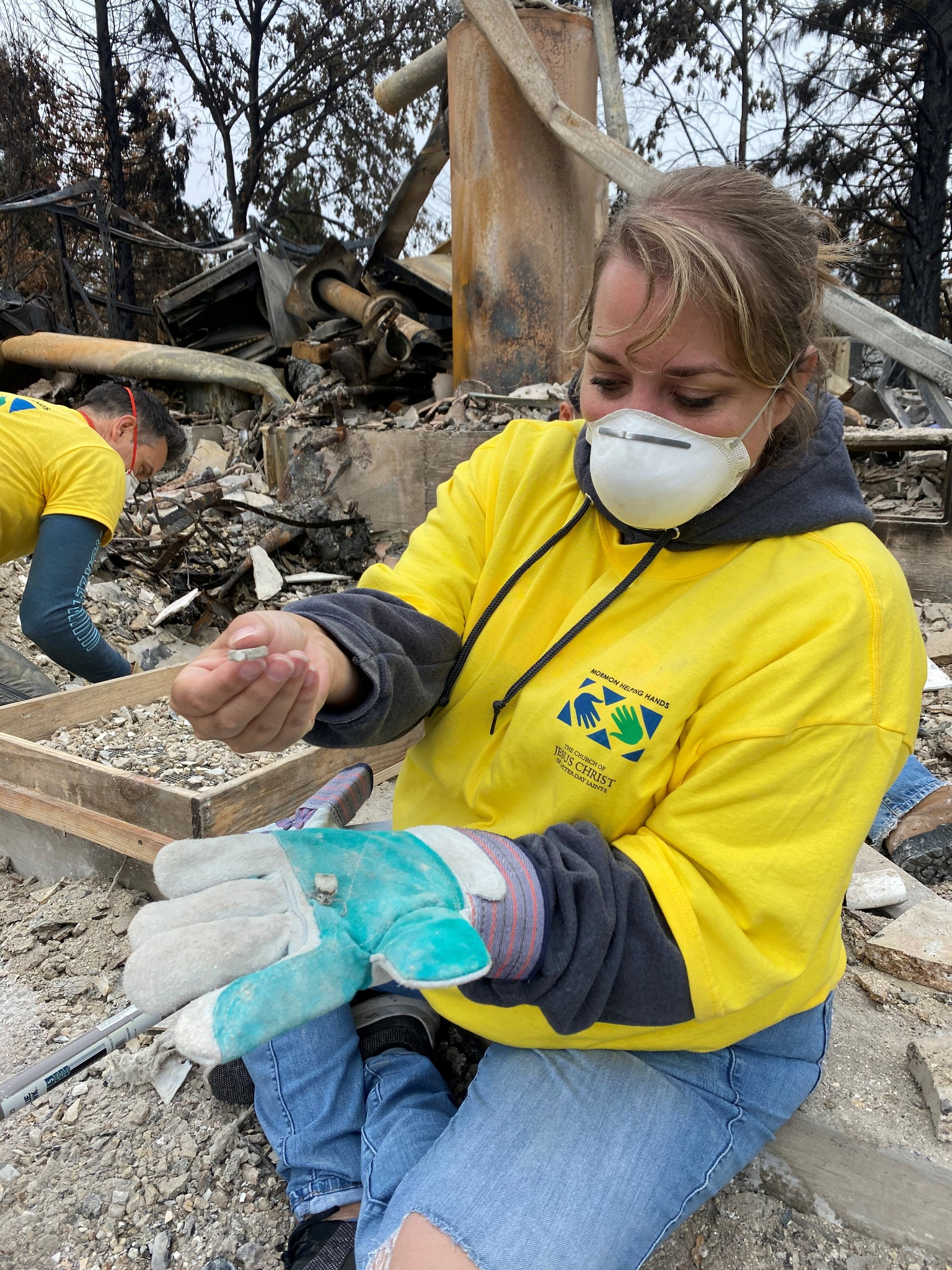 Saturday morning, members of the Medford and Central Point Oregon Stakes gathered for a service project to help those who have lost homes. They put on yellow Helping Hands shirts and N95 face masks and grabbed fire kits to help families sift through the ashes on their properties to find anything of value.