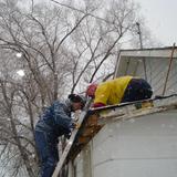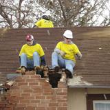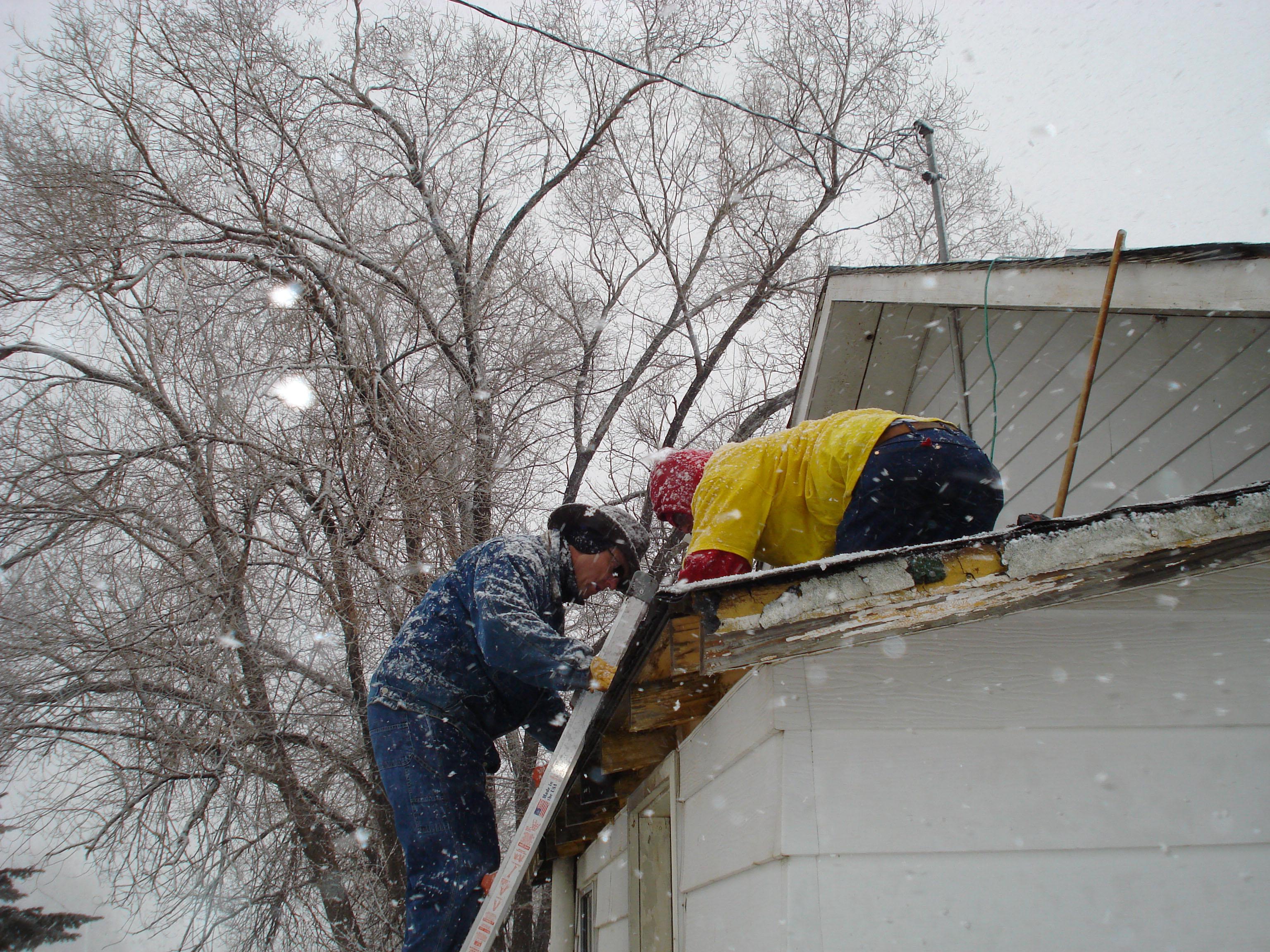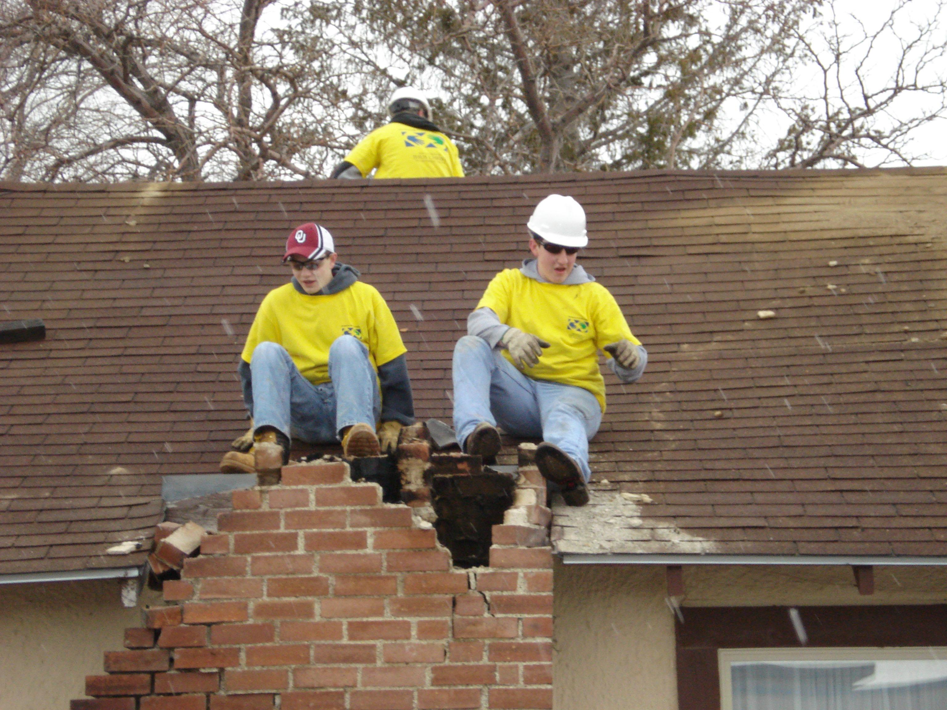 Despite windy, snowy conditions, four roofing projects were completed. Damaged chimneys were removed and roofs were reshingled on houses and on a Catholic church building.