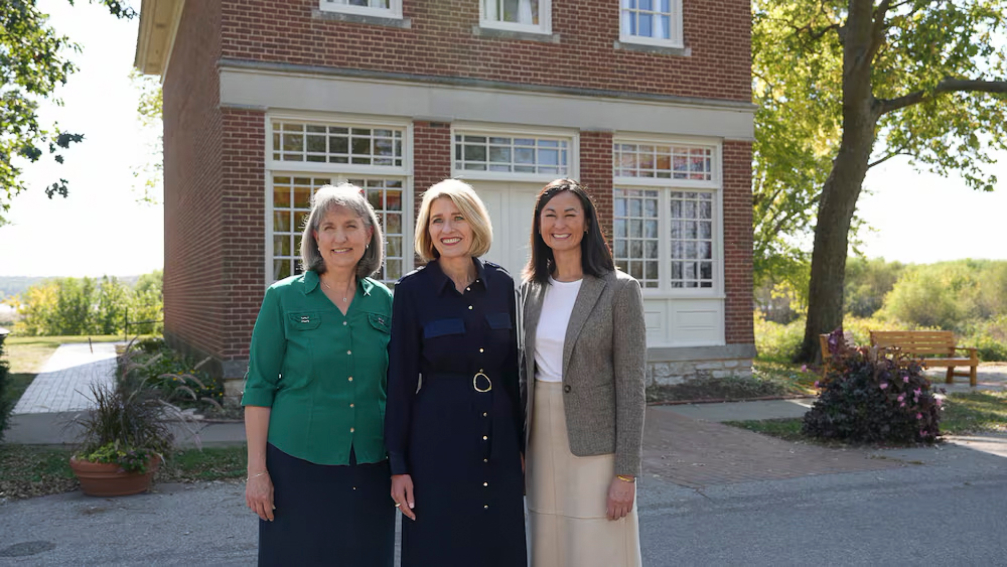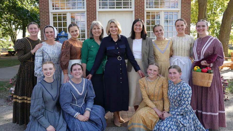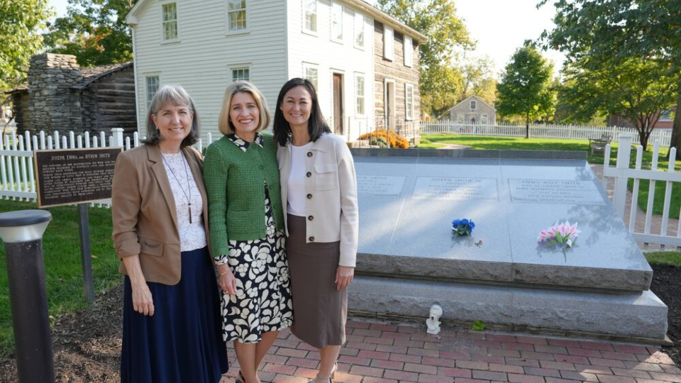 Relief Society General President Camille N. Johnson, center, stands with Sister J. Anette Dennis, First Counselor, left, and Sister Kristin M. Yee, Second Counselor, right, outside the Red Brick Store in Nauvoo, Illinois, during the filming of the Relief Society worldwide devotional on Sunday, March 16, 2025. 2025 by Intellectual Reserve, Inc. All rights reserved.Just as women in Nauvoo created a covenant community, “we’ve created a covenant community all around the world now as sisters who participate in priesthood ordinances and make and keep covenants. We’ve created a global community to bless the lives of our brothers and sisters,” said President Johnson.