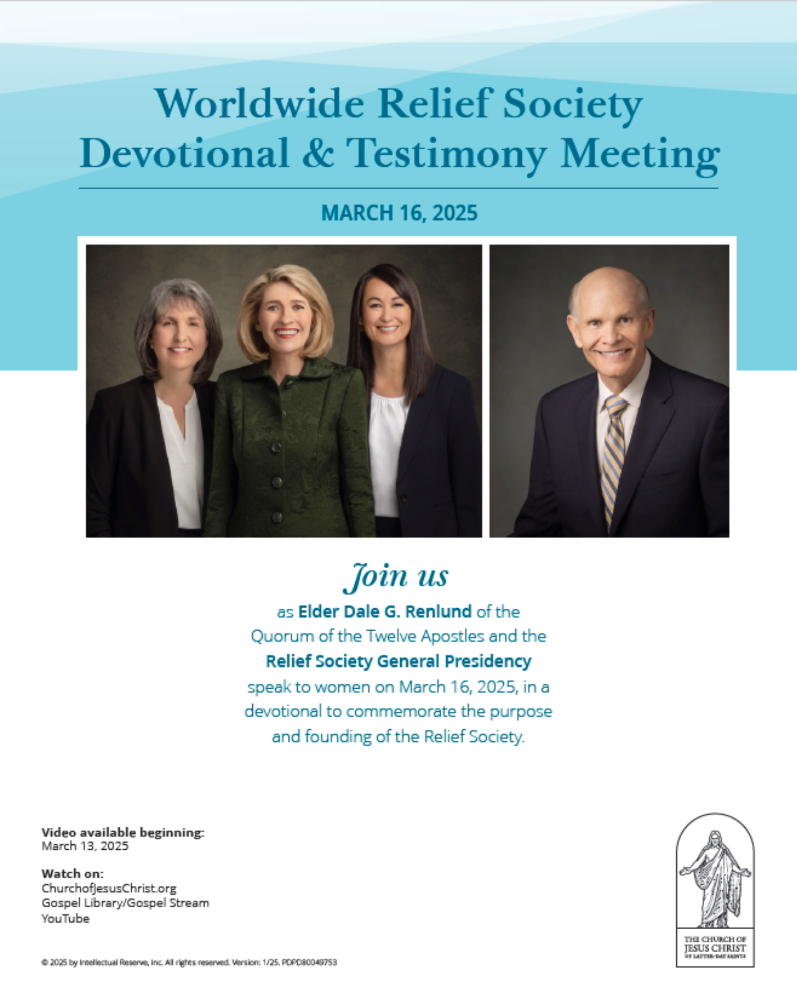 Elder Dale G. Renlund of the Quorum of the Twelve Apostles.2021 by Intellectual Reserve, Inc. All rights reserved.Stake or ward Relief Societies are encouraged to gather locally on the evening of March 16 to view the 40-minute devotional. Following the devotional, Relief Societies will have the opportunity to hold a local testimony meeting where sisters can share their faith in Jesus Christ.
