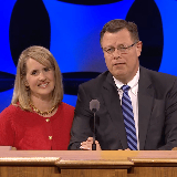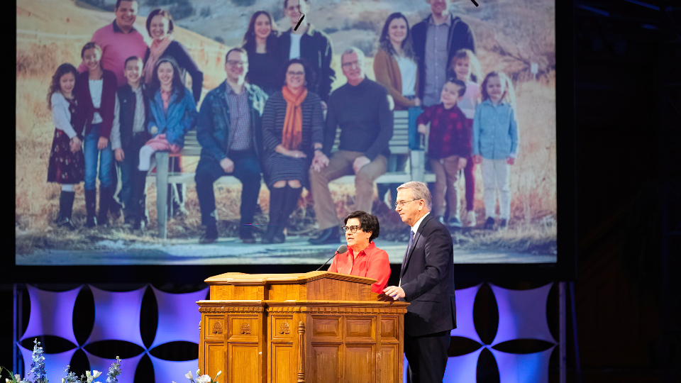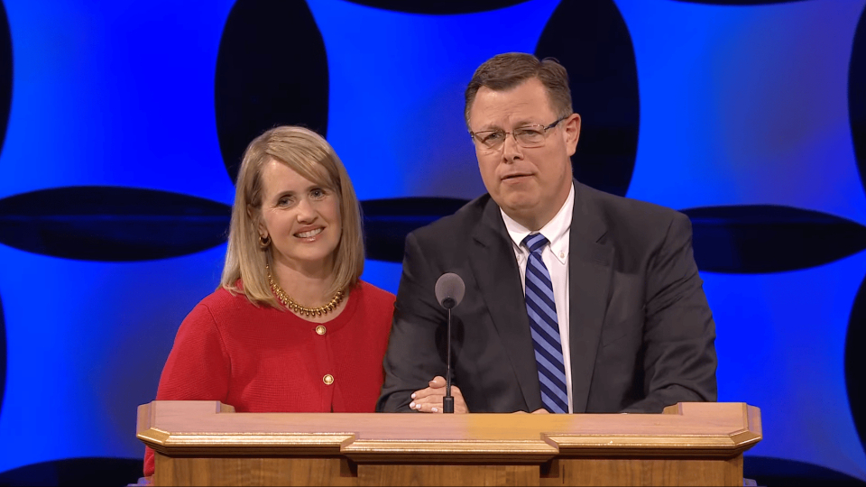 Elder Clark G. Gilbert, a General Authority Seventy, and his wife, Christine, speak in a Worldwide Devotional for Young Adults broadcast from the Salt Lake Tabernacle in Salt Lake City on May 5, 2024. Photo is a screenshot from the broadcast.2024 by Intellectual Reserve, Inc. All rights reserved.