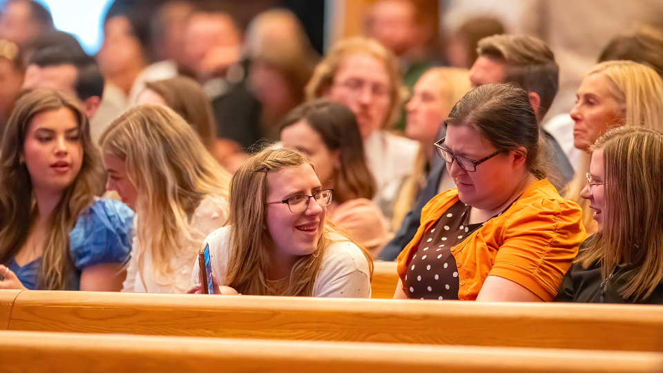 Young adults talk before Elder Carlos A. Godoy of the Presidency of the Seventy and his wife, Mônica, speak at a Worldwide Devotional for Young Adults broadcast from the Salt Lake Tabernacle in Salt Lake City on May 5, 2024. Photo by Adam Fondren, courtesy of Church News. Copyright 2024 Deseret News Publishing Company.