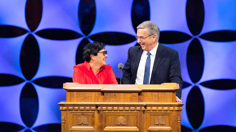 Elder Carlos A. Godoy of the Presidency of the Seventy and his wife, Mônica, speak in a Worldwide Devotional for Young Adults broadcast from the Salt Lake Tabernacle in Salt Lake City on May 5, 2024. Photo by Adam Fondren, courtesy of Church News.Copyright 2024 Deseret News Publishing Company.
