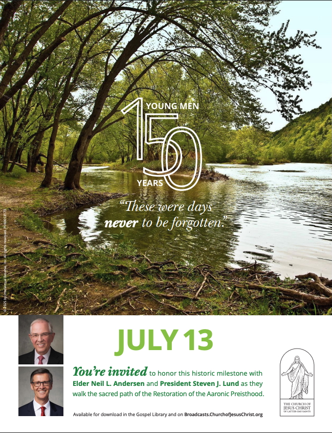 The Susquehanna River in Harmony, Pennsylvania, USA.© 2025 by Intellectual Reserve, Inc. All rights reserved.Elder Neil L. Andersen of the Quorum of the Twelve Apostles and Young Men General President Steven J. Lund of The Church of Jesus Christ of Latter-day Saints will participate in a worldwide broadcast on July 13, 2025, honoring the sacred restoration of the Aaronic Priesthood and commemorating the 150th anniversary of the Young Men organization.