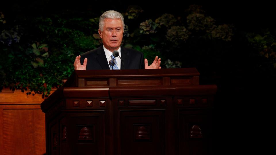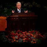 - President Dieter F. Uchtdorf of the First Presidency speaks at the Saturday morning session of general conference, 5 October 2013